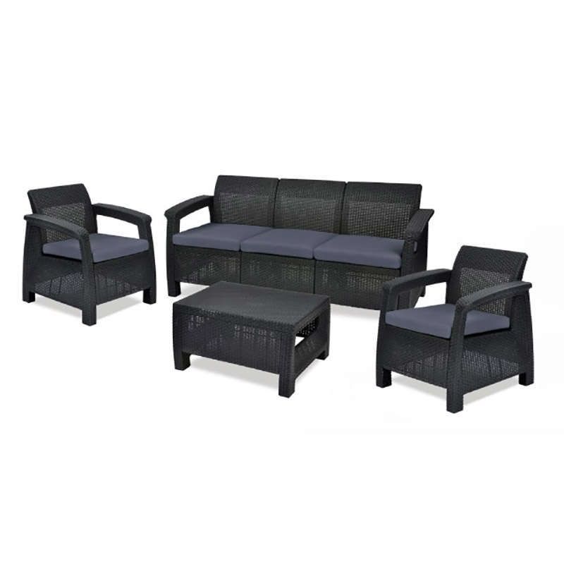 Комплектът включва 1 3-местен диван и 2 фотьойла заедно с възглавници и 1 маса. Подходящ за вътрешна и външна употреба.