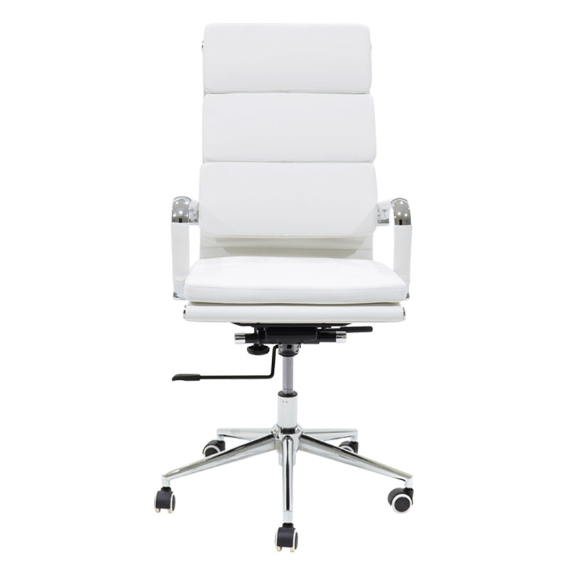 The Tokyo office chair is upholstered in white soft touch leather accented with a chromed steel base. The fixed, arched arms are padded for added comfort and the waterfall seat reduces leg pressure for improved circulation. This modern office chair has five 2" hooded casters, a tilt tension knob, a tilt lock lever and a pneumatic height adjustment.