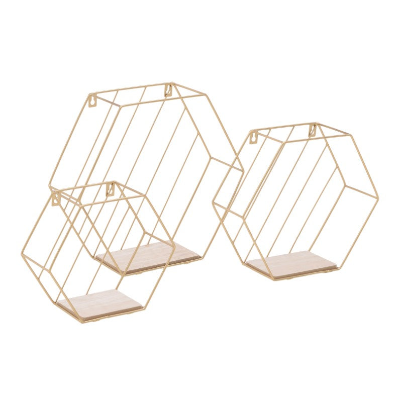 Wall shelf set of 3 pieces Inlo Inart gold-natural metal-wood 34x11x30cm